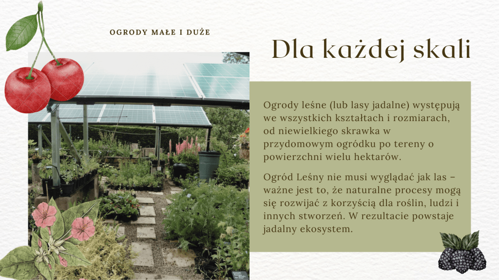 Ogród Leśny nie musi wyglądać jak “las” – ważne jest to, że naturalne procesy mogą się rozwijać z korzyścią dla roślin, ludzi i innych stworzeń, wzmacniając plenność, odporność i bioróżnorodność miejsca. W rezultacie powstaje jadalny ekosystem, łączący uprawy warzywne, owocowe, wieloletnie, zielarskie i surowcowe, z maksymalnym wykorzystaniem przestrzeni i jej różnych pięter.