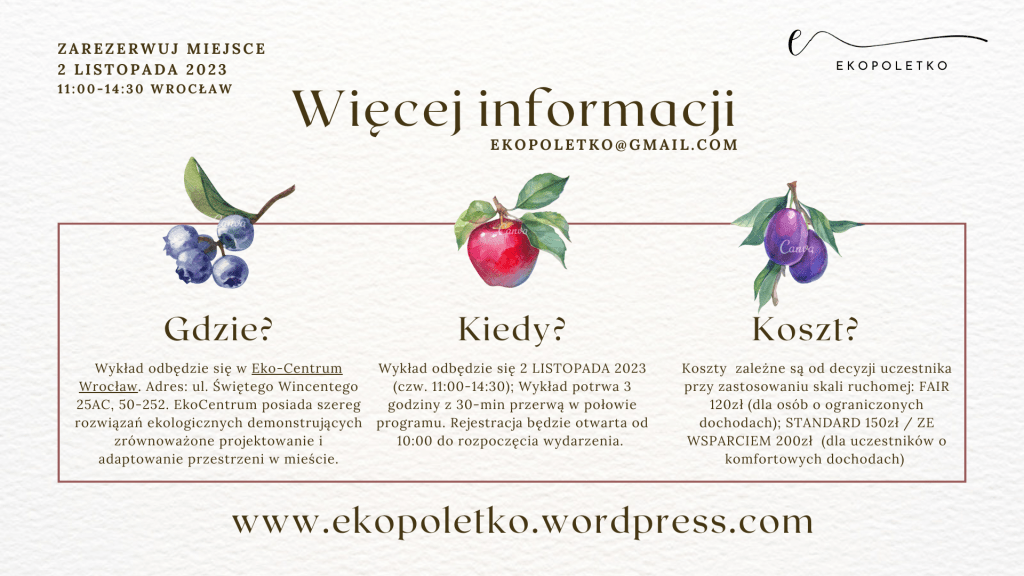 Gdzie: Wykład ugości Eko-Centrum Wrocław, ze wsparciem Fundacji Ekorozwoju, partnera wydarzenia. Lokalizacja w sercu wrocławskiego Nadodrza pozwoli na dogodny dojazd osobom nawet z dalszych regionów.