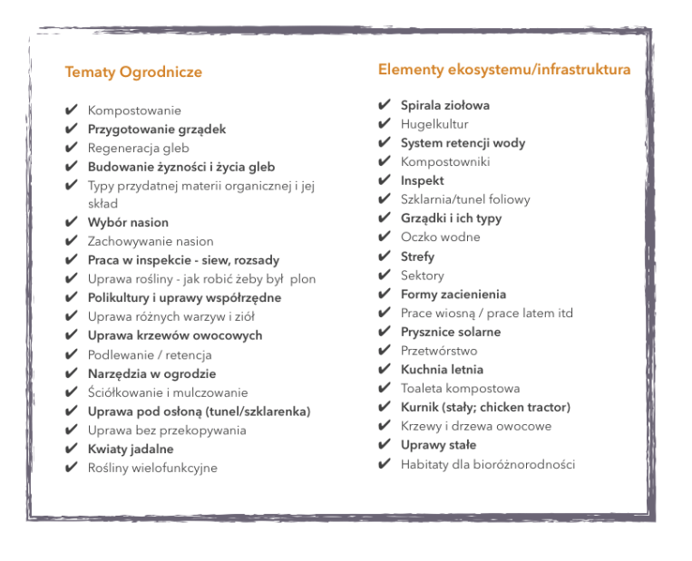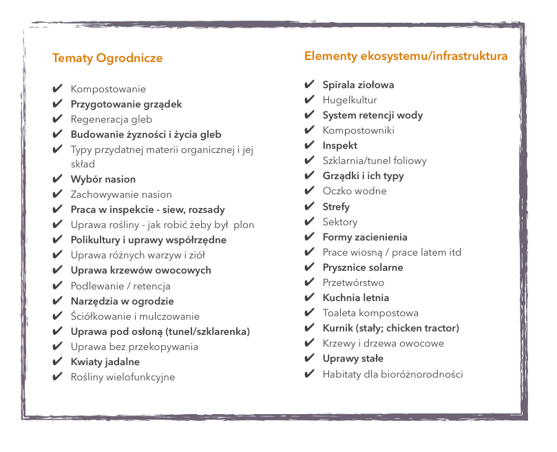 W 2019 w ramach 7x warsztatów projektowania permakultury, miałam okazję spotkać się z ponad 150 osobami projektującymi swoje ekosystemowe ogrody i siedliska. Rozumiem jakie są najczęstsze pytania i potrzeby związane z poszerzaniem umiejętności i wiedzy w ogrodnictwie oraz pierwszymi krokami na nowym gruncie. W kontekście poznawania swojego kawałka Ziemi i uczenia się alchemii ogrodnictwa, cyklów w ekosystemie, procesów życia roślin oraz życia na wsi.