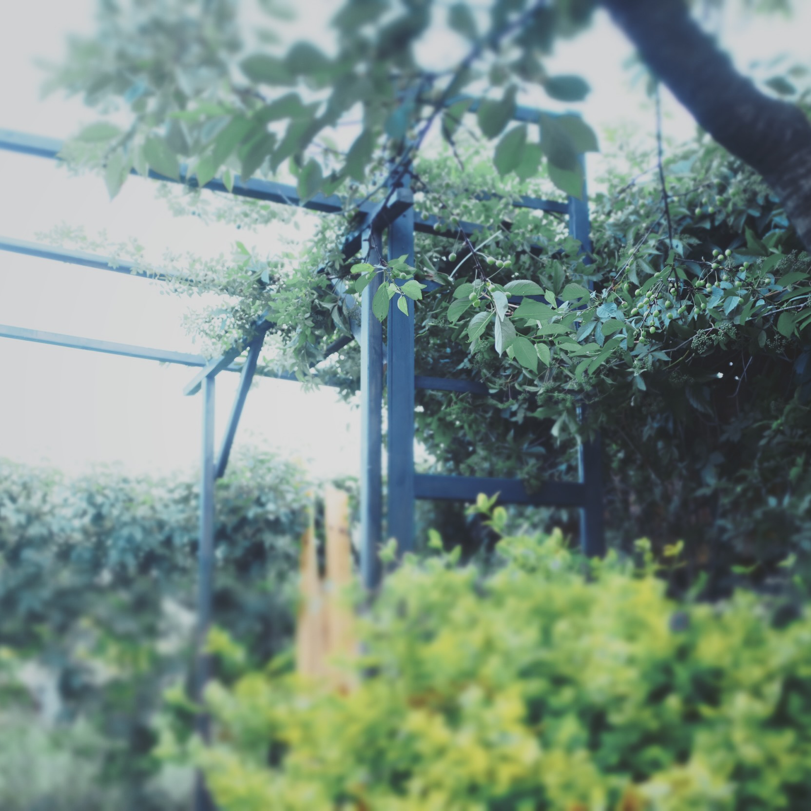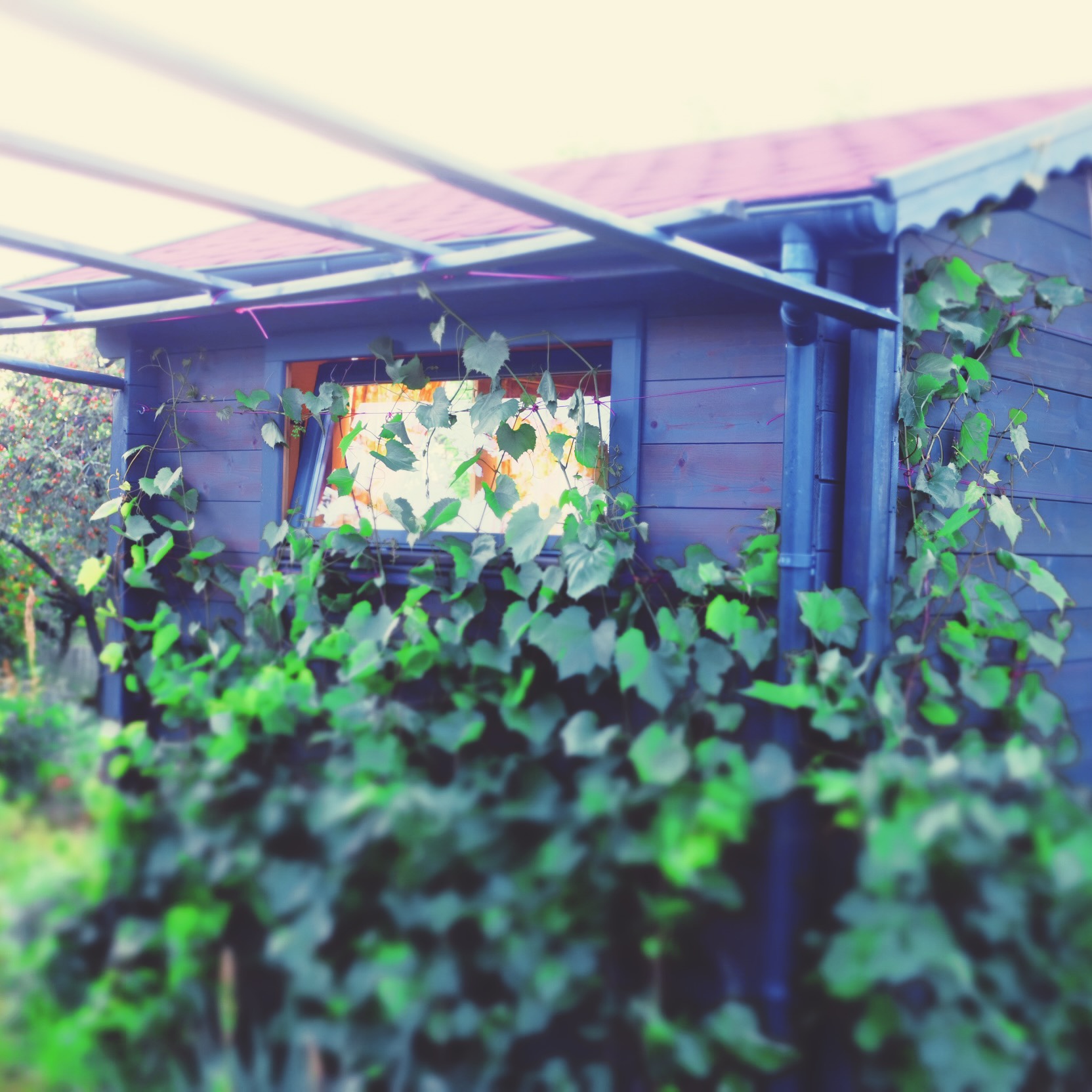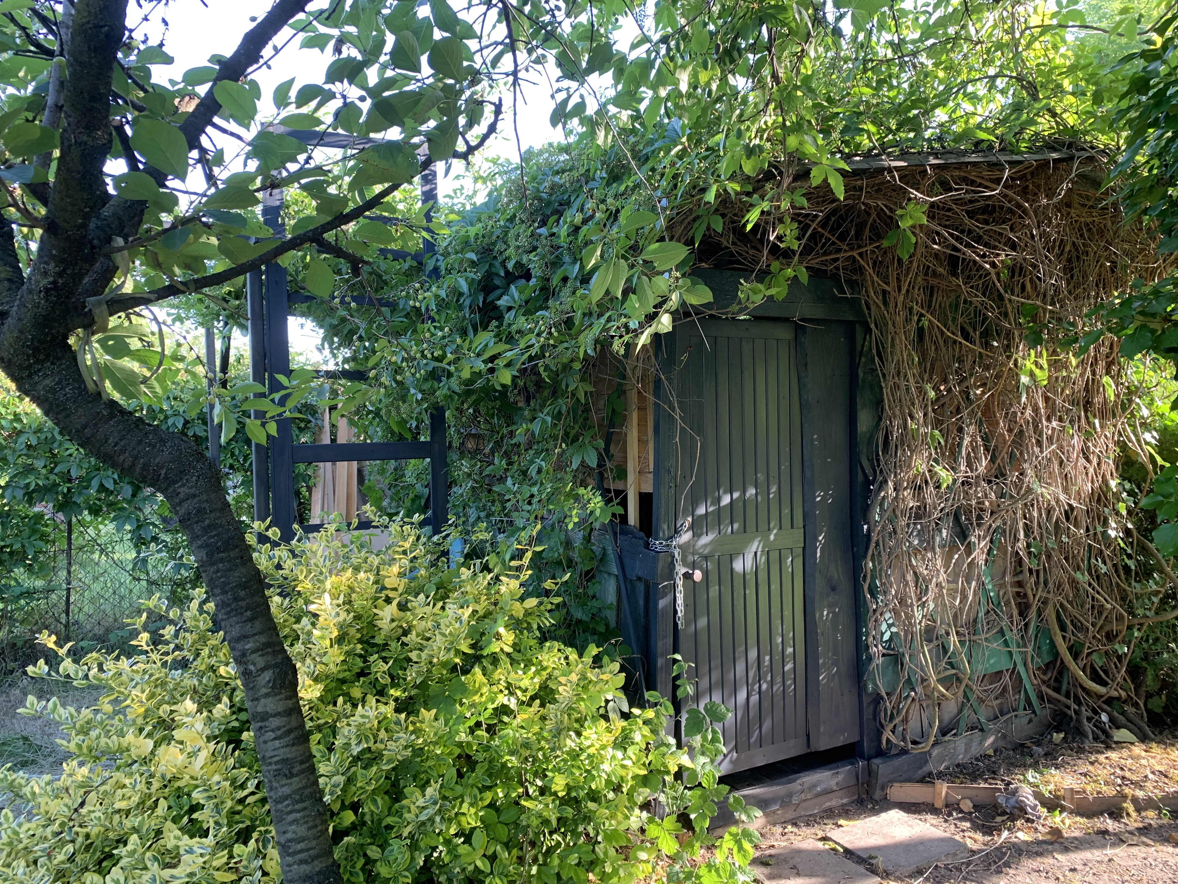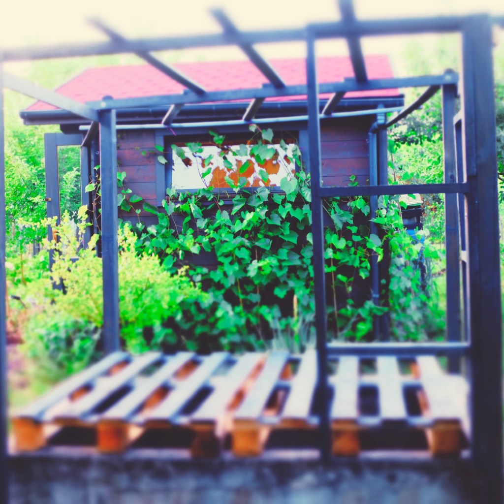 1. ALTANA: Zadaszona, przewiewna, obrośnięta bluszczem, dziką różą oraz winobluszczem (w wyposażeniu stół i ławki drewniane, szafka, półki oraz przedmioty użytku domowego do biesiad; konstrukcja solidna, 2,5×2,5m wys.2m)