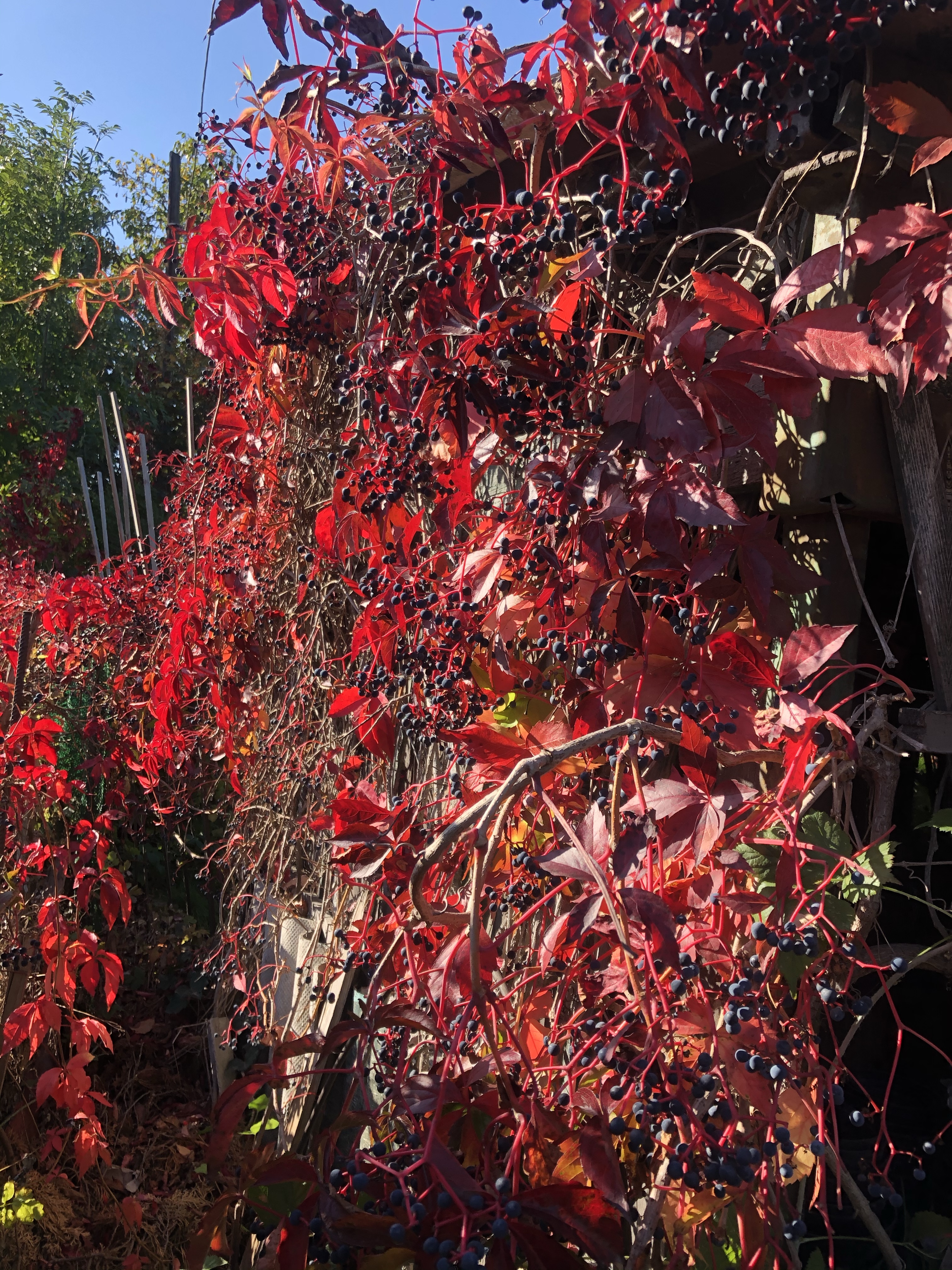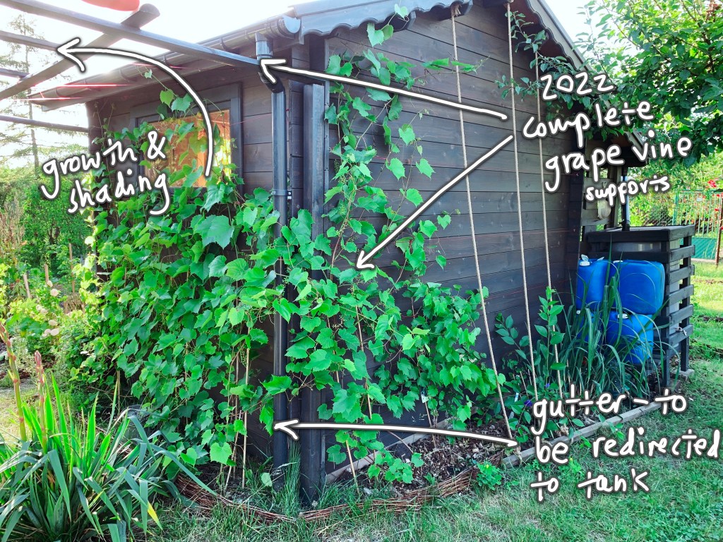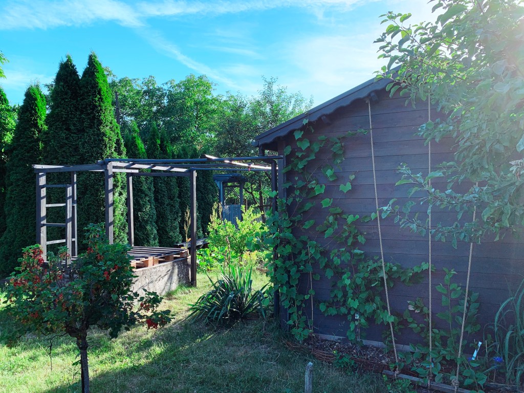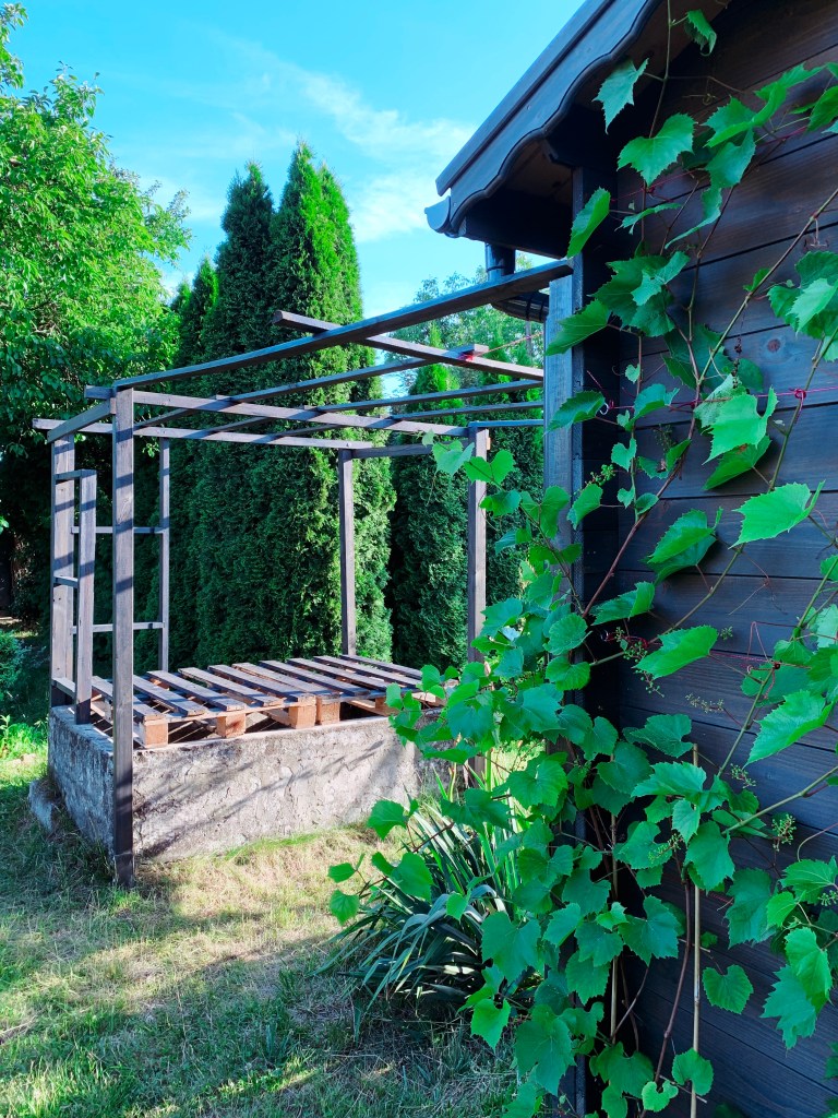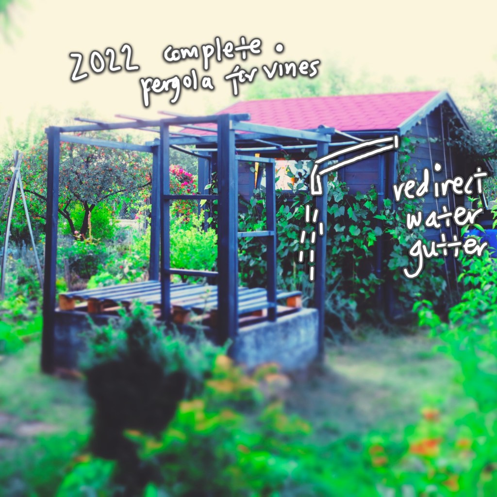 6. PERGOLE POD PNĄCZA. Południowa strona nowej altany została obudowana drewnianą pergolą przedłużoną nad największym zbiornikiem na wodę. Dojrzałe winogrona zostały podwiązanie na ścianie budynku do linek i poprowadzone wzwyż, tworząc przyszłe zacienienie pod przestrzeń jadalną i wypoczynkową. Docelowo, po dwóch stronach zbiornika powstaną dodatkowe podwyższone ramy na grządki, obsadzone pnączami kwitnącym o różnych portach roku.