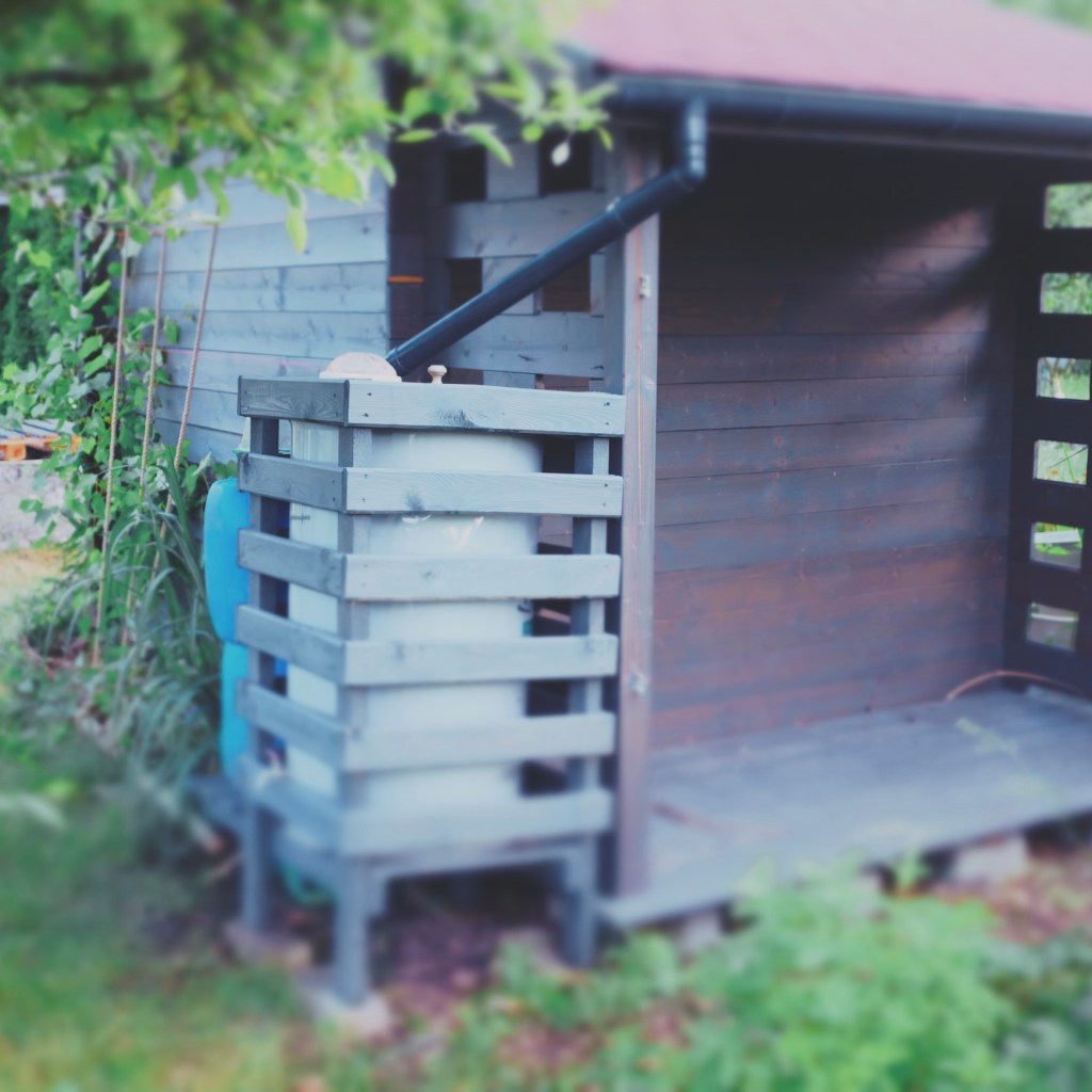 7. BECZKA NA DESZCZÓWKĘ. Od 2020 roku jeden z dachów podłączony jest rynną do stalowej beczki na deszczówkę. Struktura beczki ma półkę na dodatkowe 4x 40l beczki z wodą. Pod kranikiem z wodą z wodociągu stoi natomiast duży okrągły pojemnik budowlany, który pozwala na łatwe i szybkie czerpanie dużych ilości wody wiadrami oraz opłakiwanie rąk lub sprzętów po skończonej pracy.
