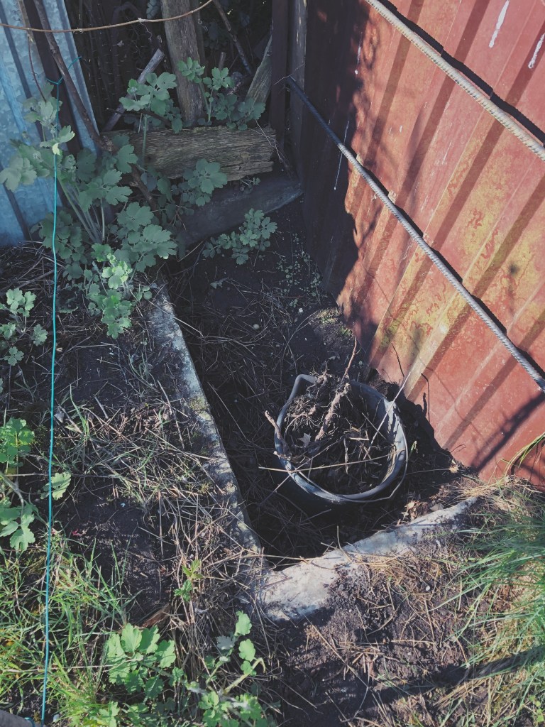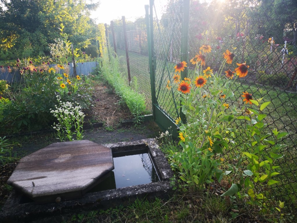 3. ZBIORNIKI WODNE: ze względu na rzadkie pobyty, zbiorniki wciąż czekają na odnowę (wypełnienie przeciekających szczelin, pomalowanie farbą basenową) oraz możliwe obsadzenie 1-2 roślinami wodnymi. Jeden ze zbiorników został zabudowany pergolą łączącą go z nową altaną (patrz poniżej)