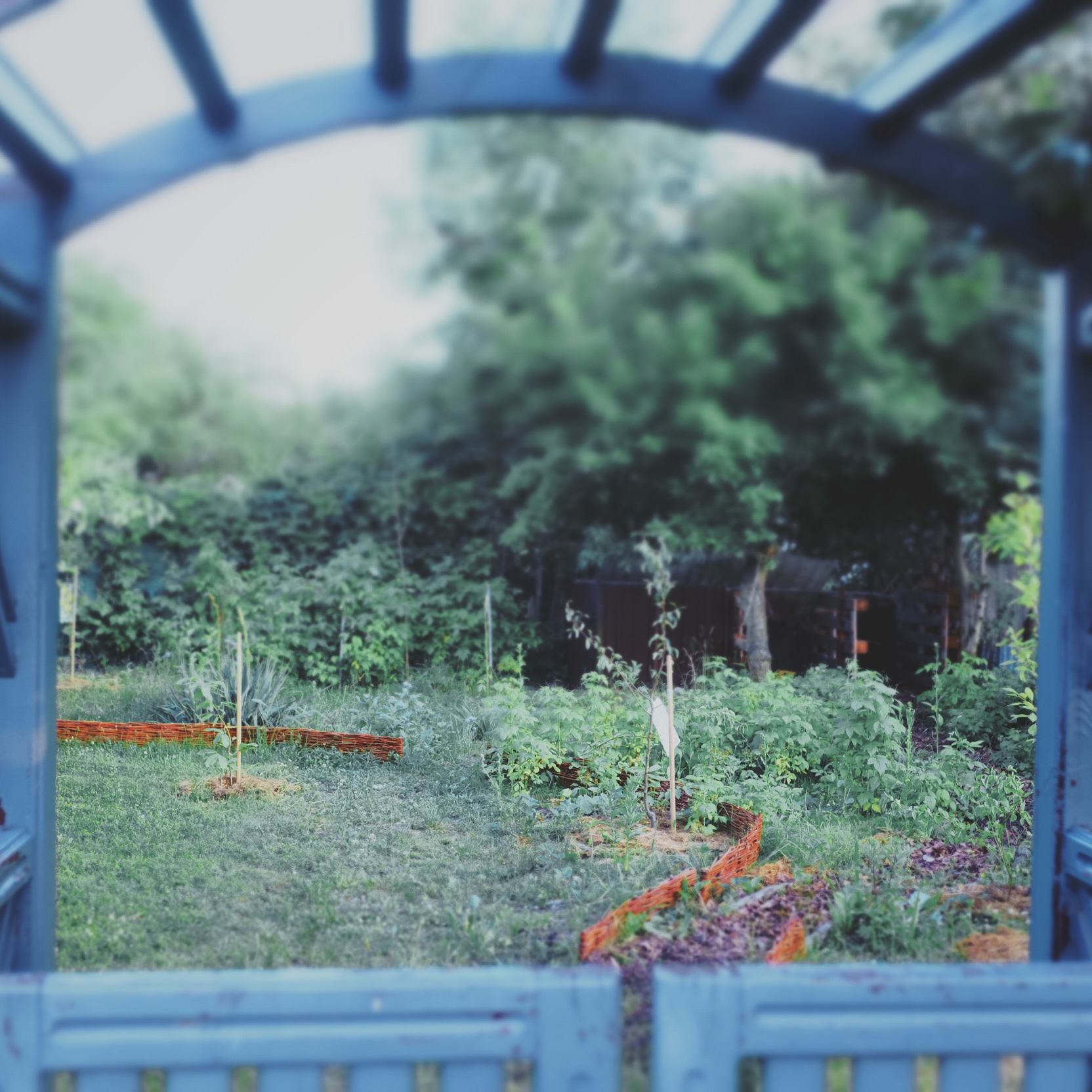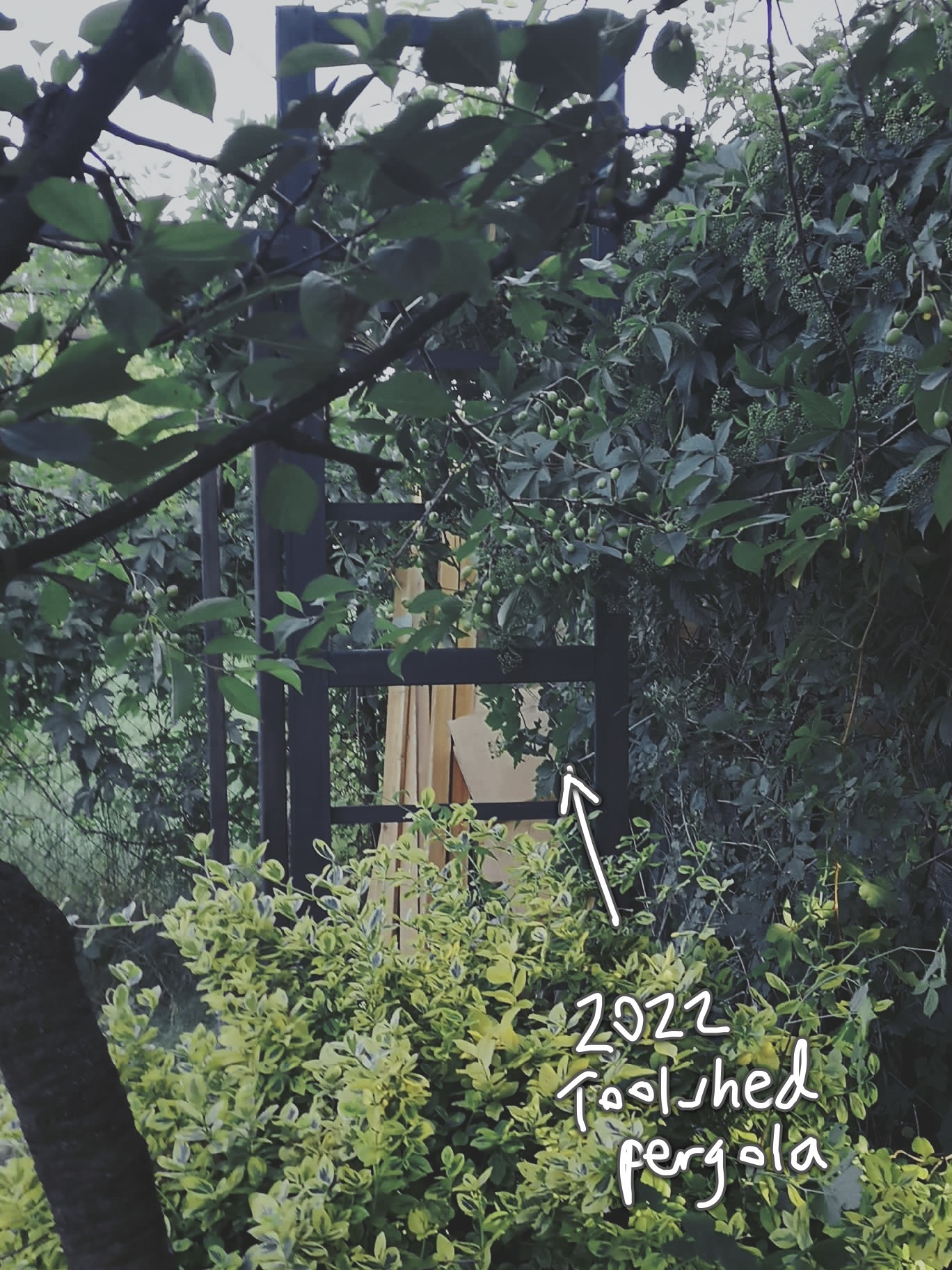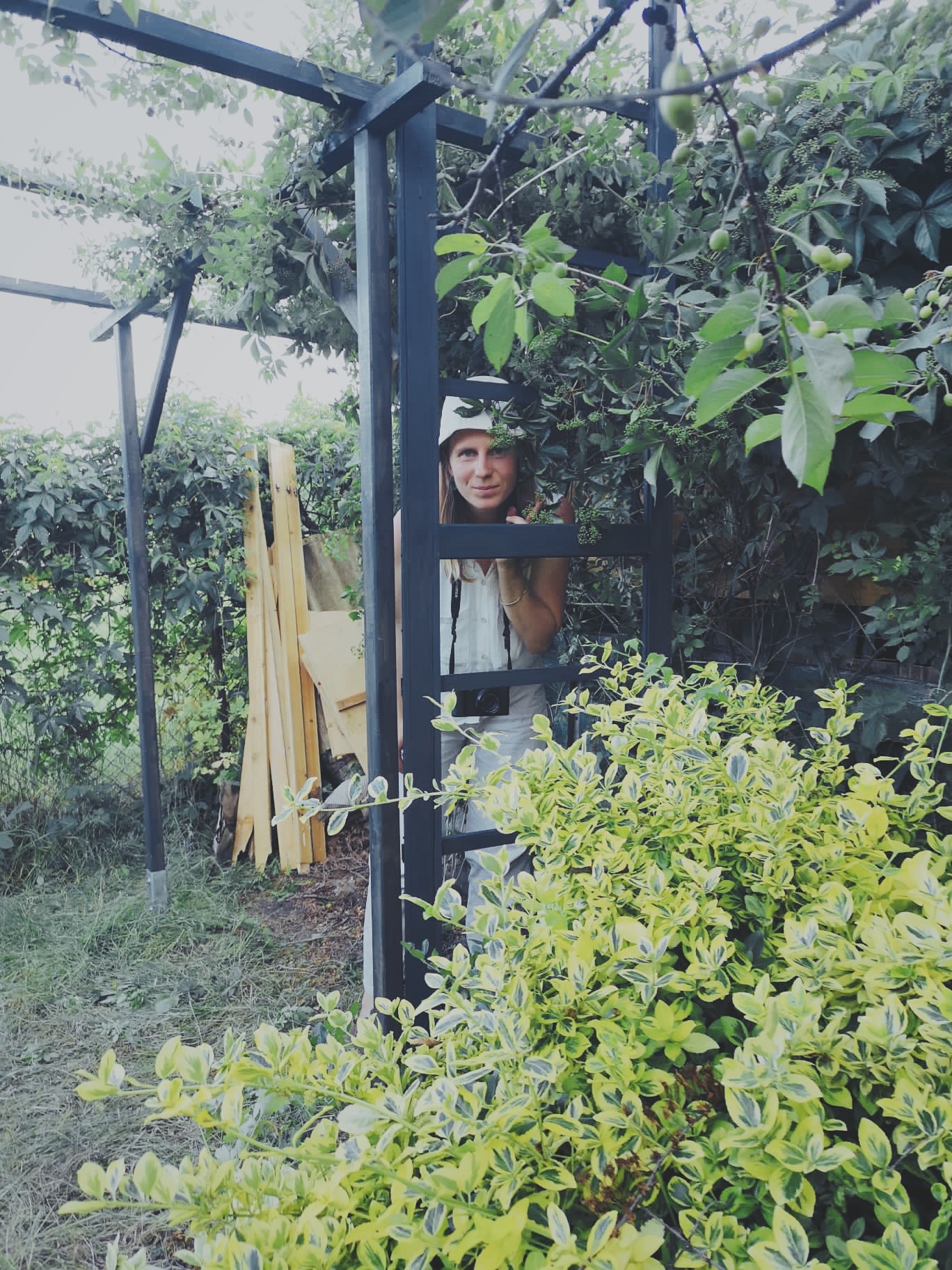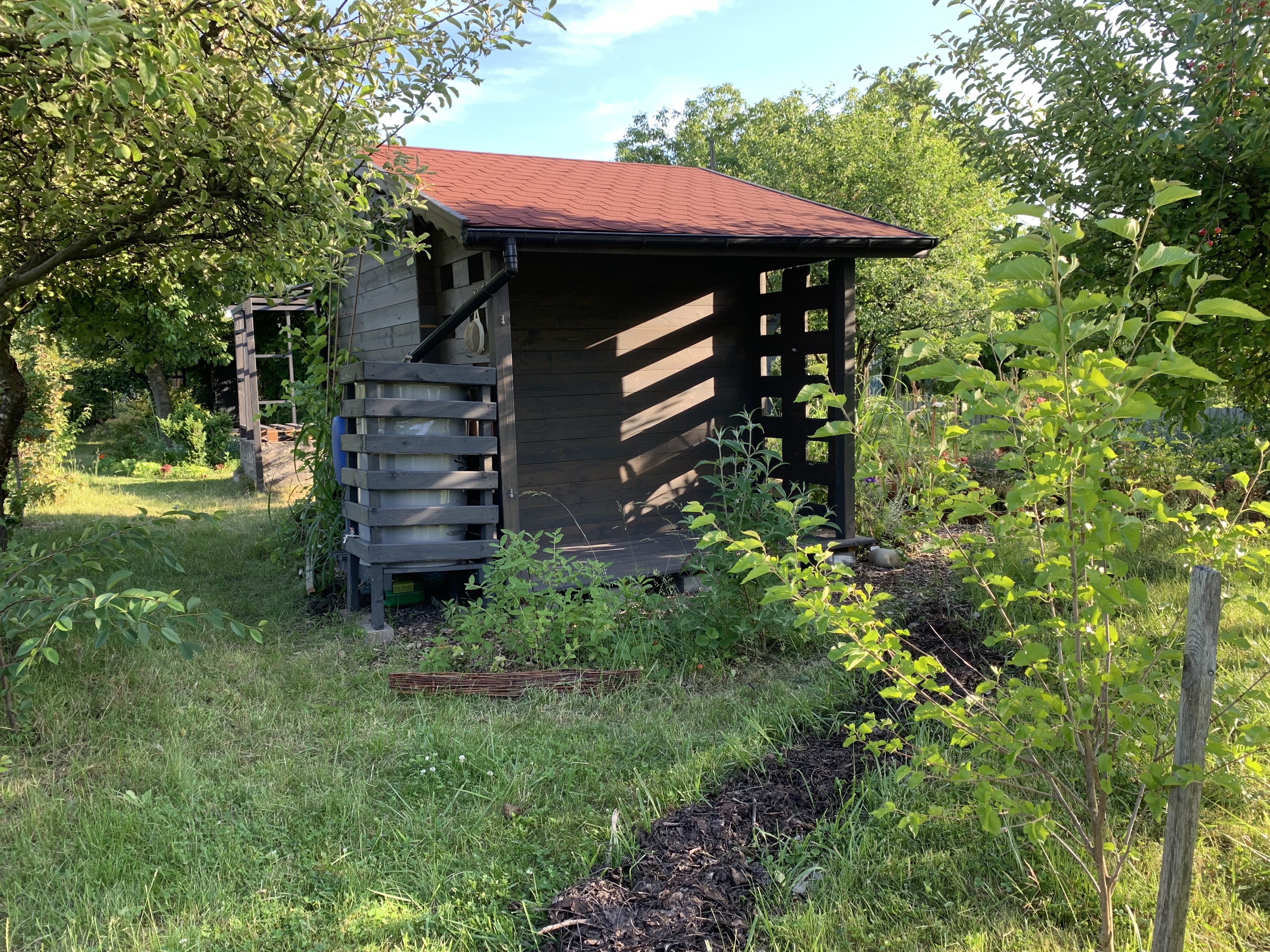 Dodatkowo, podobna pergola o lżejszej konstrukcji została dobudowana po wschodniej stronie NARZĘDZIOWNI, przedłużając zadaszenie roślinne i tworząc przestrzeń na podręczny składzik znalezionych materiałów, zrębek a także prostą (wiaderkową) toaletę kompostującą.