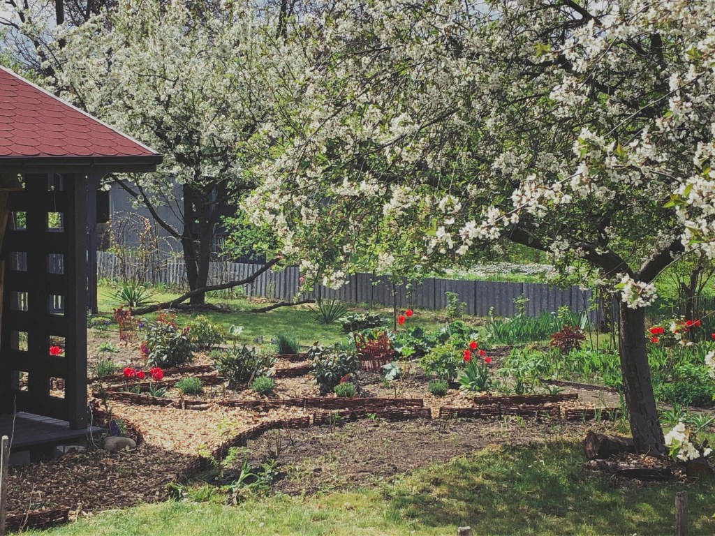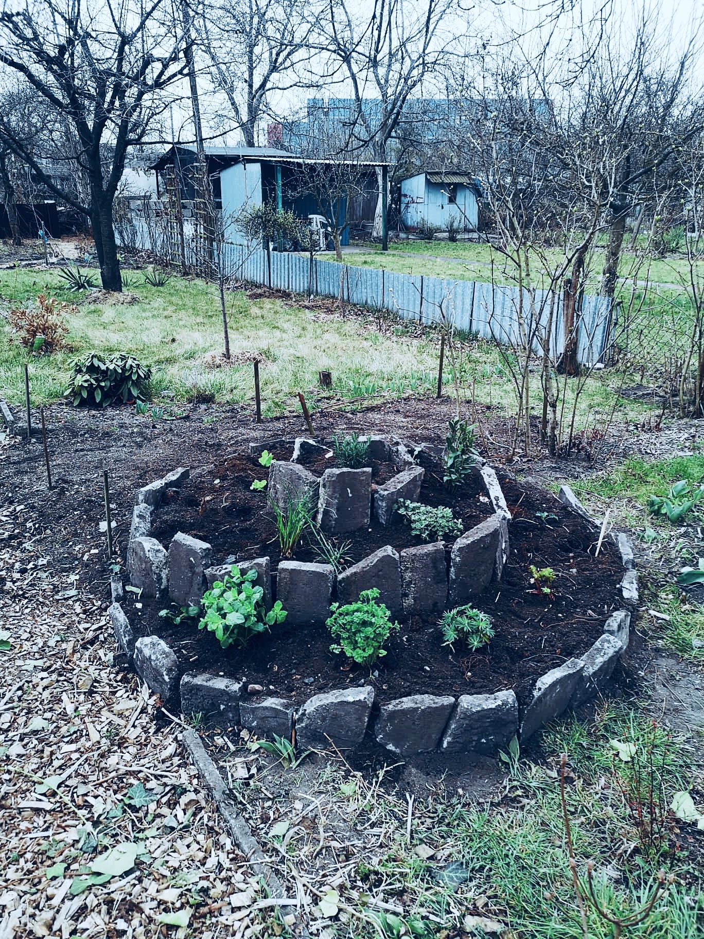 8. SPIRALA ZIOŁOWA. Równolegle z dekonstrukcją ścieżki głównej w części rekreacyjnej oraz przewożenia kompostu sąsiadki, powstał nadmiar materiału, pozwalający na efektywną konstrukcję SPIRALI ZIOŁOWEJ bez żadnych zakupów materiałów z zewnątrz. Spirala powstała w zaprojektowanym dla niej miejscu, a jej strukturę stanowią nieregularne płyty chodnikowe, wcześniej osadzone pionowo i służące jako krawędzie ścieżki. Ze względu na połączenie (i synergię) prac (przewożenie płyt z miejsca w miejsce odbyło się jednokrotnie dla oszczędności energii i czasu), został zakopany bez przesądzenia zagon z konwaliami. Te jednak wybiły się przez grządkę spirali, nawet przez warstwę grubości ok. 50cm. Spirala stała się też wizualnym wyznacznikiem nowej Gildi wokół dojrzałej wiśni obok. Lokalizacja spirali pozwala na zerwanie kilku ziół i liści sałatkowych bezpośrednio w drodze do domu po zamknięciu altany.