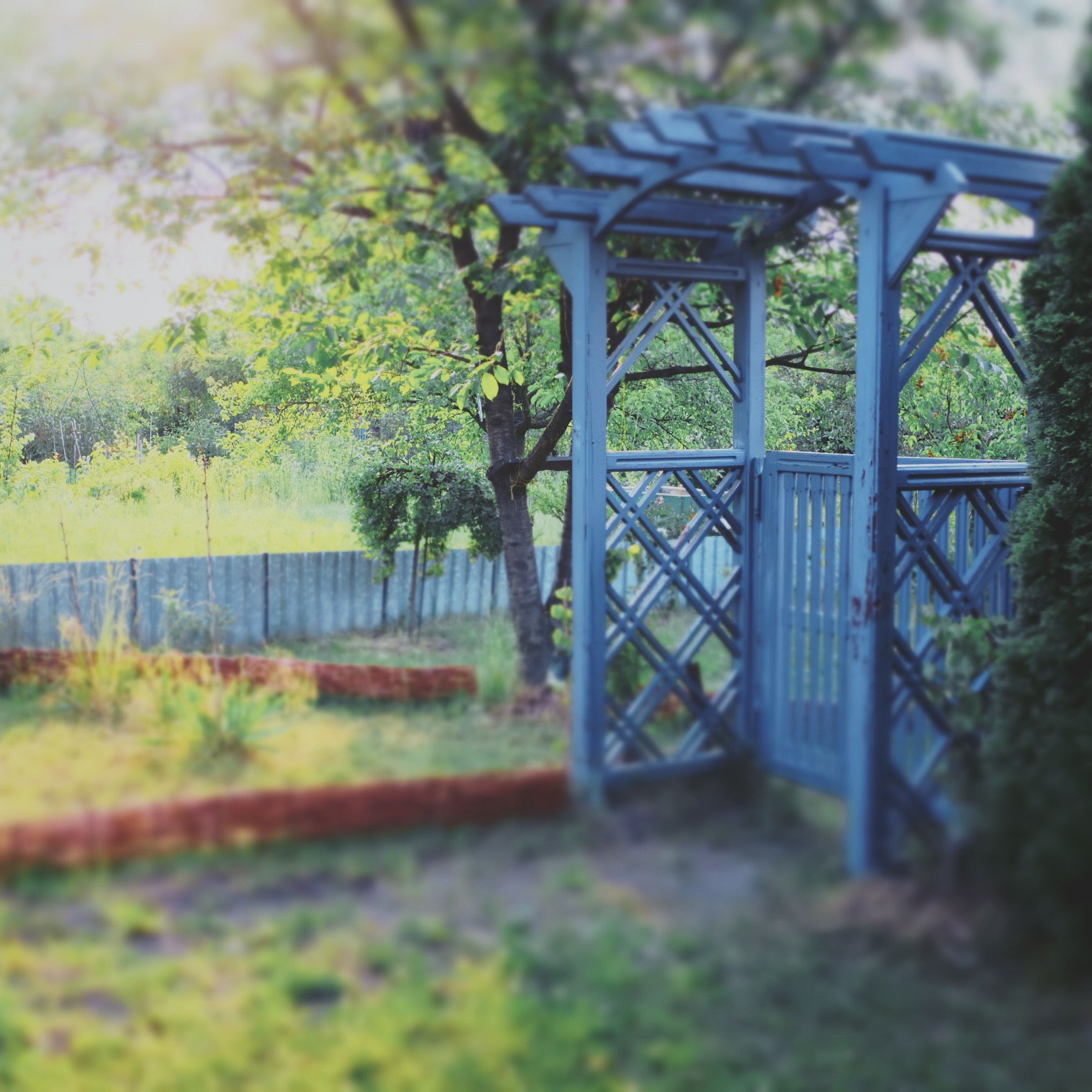 7. PERGOLE WEJŚCIOWE (BRAMKI). Dwie pergole zostały umieszczone w centralnej osi działki, jedna przyległa do bramki wejściowej (ok.30cm szer.),; druga, solidna, ręcznie robiona przez stolarza (używana) z barową, dwustronną furtką (ok. 0,8m szerokości), wyznacza granicę z częścią rekreacyjną. Pergole obsadzone są kompozycją winogrona, bluszczu i …