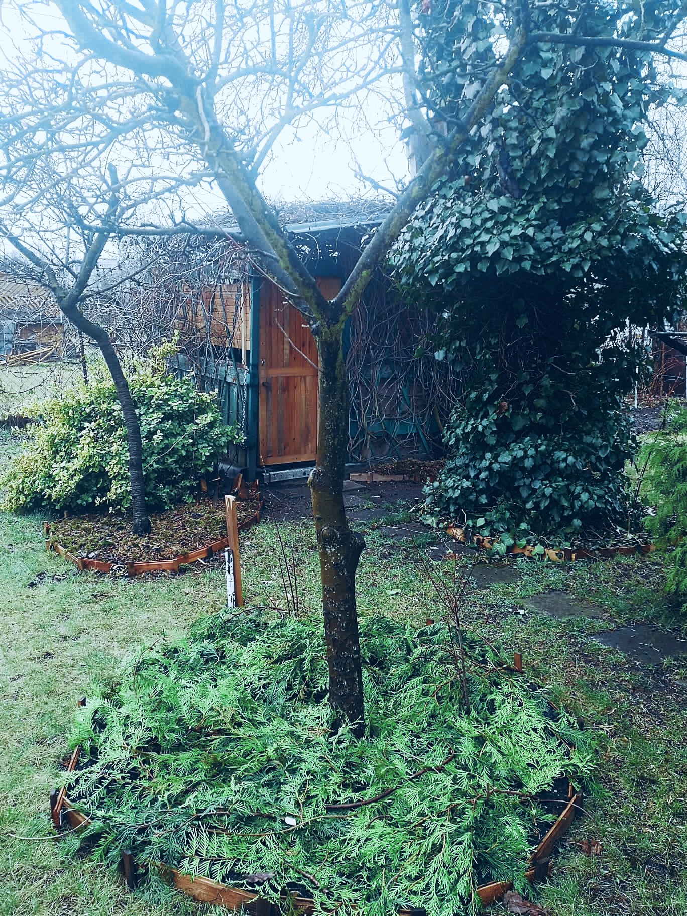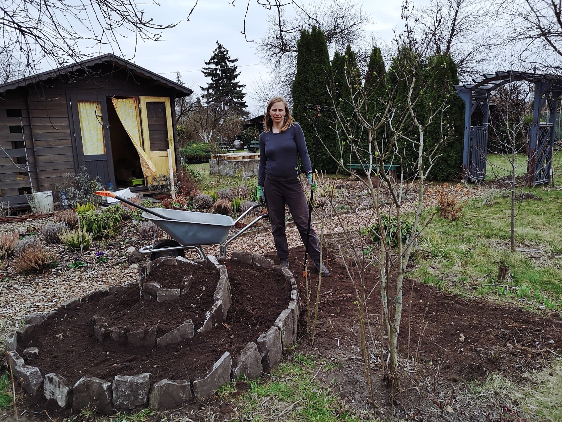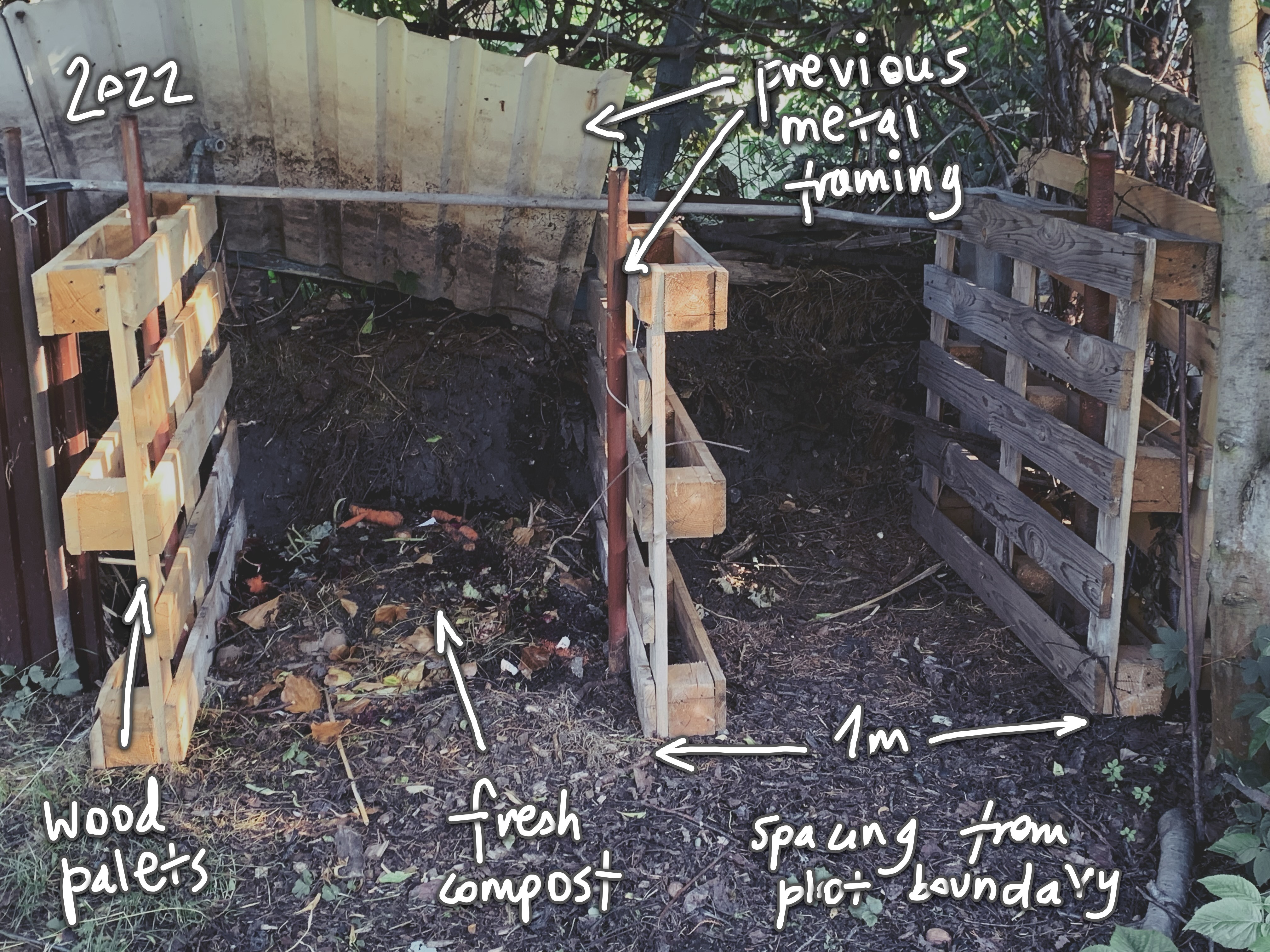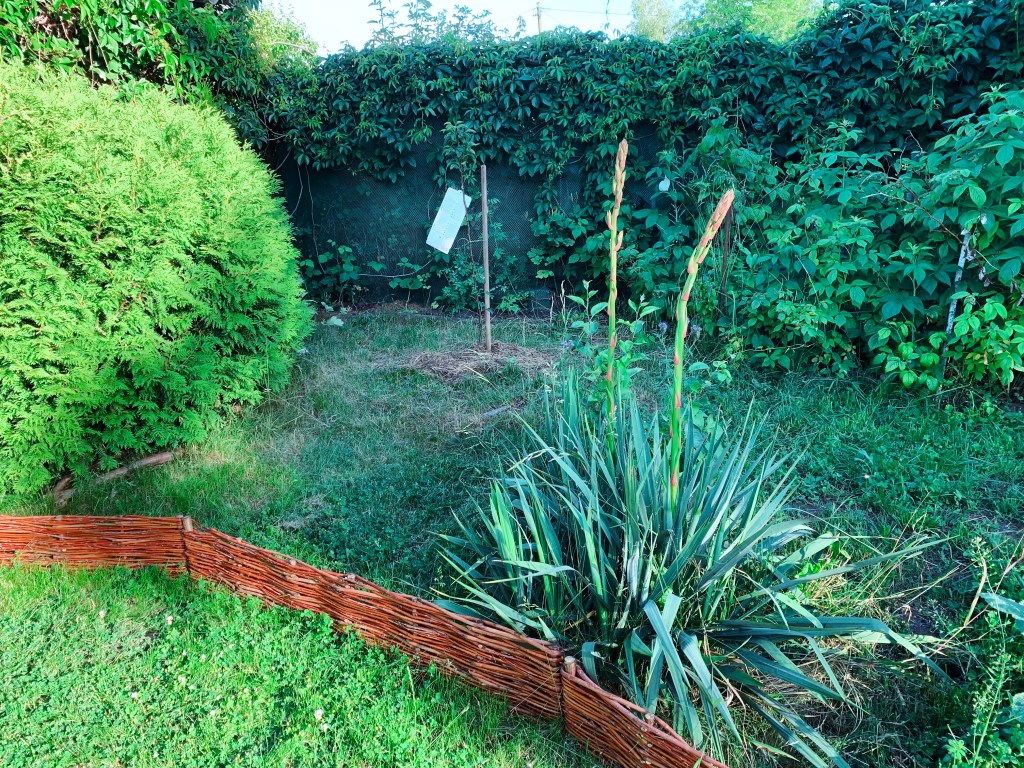 2. KOMPOSTOWNIKI: Większy kompostownik został zredukowany do 2m (*wymóg dostosowania odległości od granicy z sąsiadem do 1m); część ogrodzona blachą pomniejszona została tak, aby zmieściły się dwa dodatkowe moduły z drewnianych palet i łatwym dostępem dla taczki (poprzedni design był niefunkcjonalny i jednokierunkowy – pozwalał na deponowanie materii organicznej, ale bez łatwej możliwości wybierania kompostu). Metrowy kompostownik został przeznaczony na tymczasowe miejsce do przechowywania gałęzi i zdrewniałych części roślin przed ich ponownym użyciem. Został opróżniony kompostownik sąsiadki (dzięki za niskie płotki!) o pojemności prawie 2 metrów sześciennych. Materiał pokrył podniesione grządki w Strefie 4 (wsch-płd część zacieniona), został użyty do wyrównania ścieżki części rekreacyjnej z trawnikiem oraz do wypełnienia SPIRALI ZIOŁOWEJ.