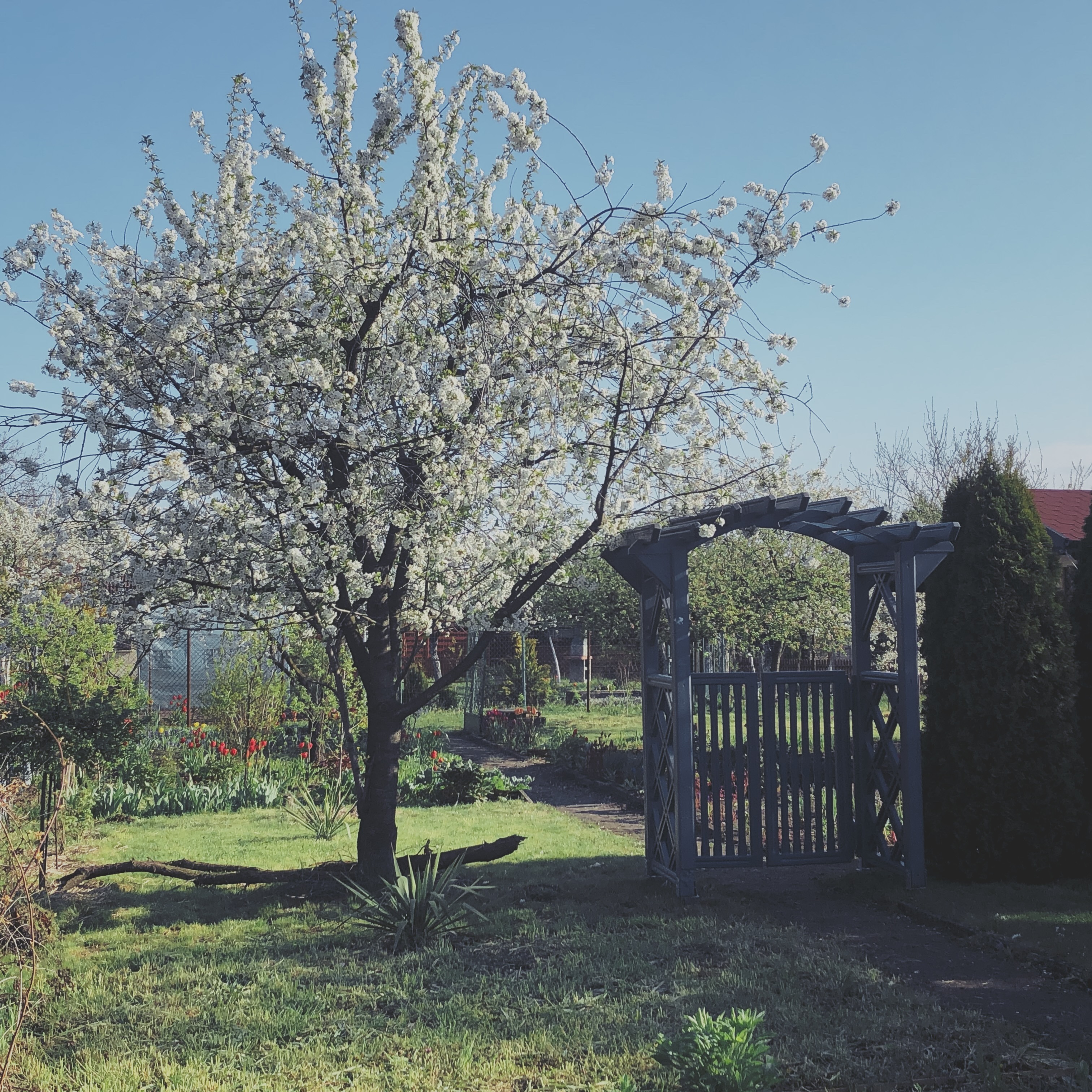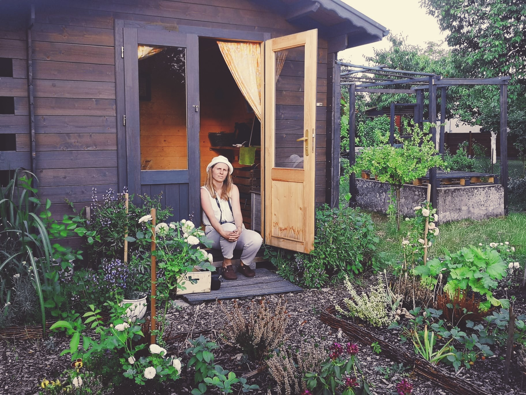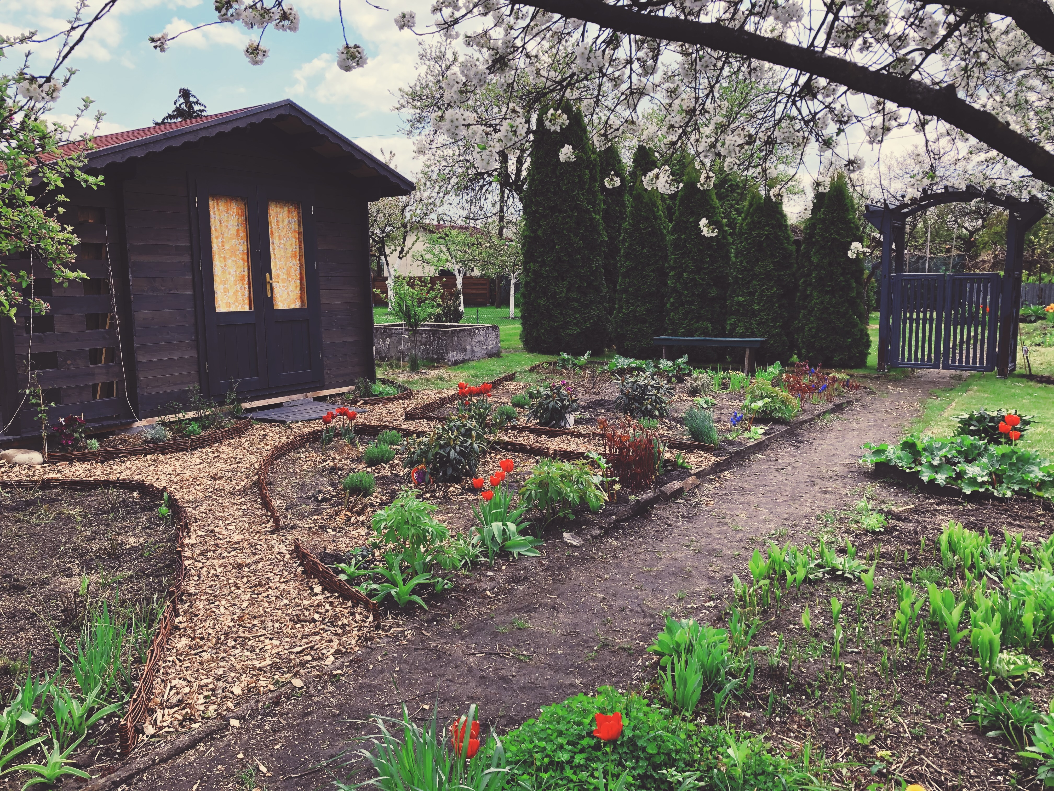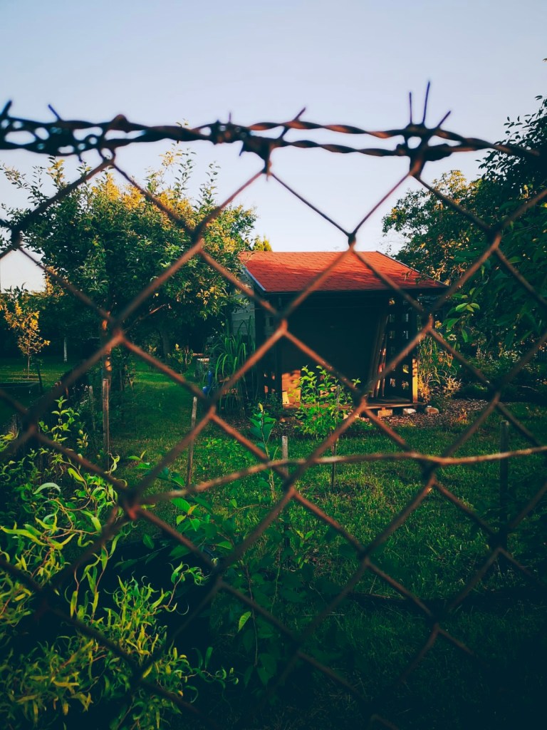 5. NOWA ALTANA. Na wiosnę 2020r.została postawiona altana wykonana w Nowym Targu i stawiany przez lokalnych rzemieślników z gór. Altana została zaprojektowana i zamówiona zdalnie, z myślą o postawieniu jej w tylnej części ogrodu. Finalnie, wymagan odległość 3m od granicy z sąsiadem oraz efekt wypełnienia kompozycji przestrzennej sprawiły, że altana została przeniesiona do części wejściowej. Pozytywne rezultaty tej zmiany to wspaniały widok na zachodzące słońce, odsłonięcie się od sąsiada tylnią ścianą oraz połączenie konstrukcyjnie pergolą domku ze zbiornikiem wodnym. Nieprzewidzianym efektem stał się niefunkcjonalny ze względu na północne ustawienie taras, widzialny z alei działkowej, który w planie, zostanie przekształcony w solidniejszą narzędziownię dla przechowywania cenniejszych sprzętów i wrażliwych na zniszczenie mebli ogrodowych.