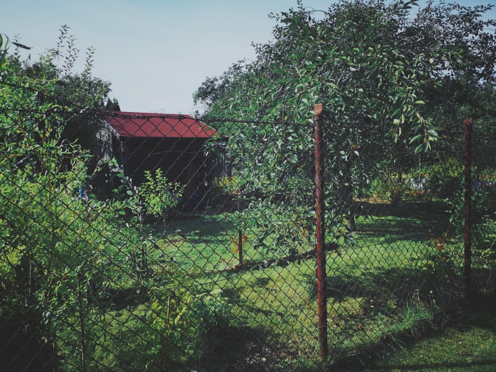 4. OGRODZENIE: wielorakie, z różnych materiałów. Od ścieżki z siatki wys.2m i drutu kolczastego z furtką; od sąsiadów bocznych niski płotek z blachy lub azbestosu na wys.kolan; od tyłu nieregularna siatka obrośnięta winobluszczem.