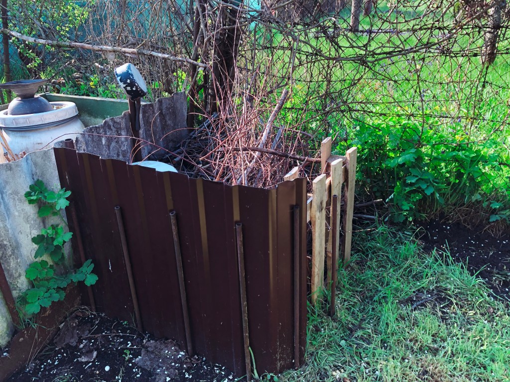 2. KOMPOSTOWNIKI: obramowany na pow. 1mx3m jednolitą blachą (niezniszczalny, solidny, wypełniony skompostowaną trawą; mniejszy 1mx1m obramowany falistym panelem z azbestosu)